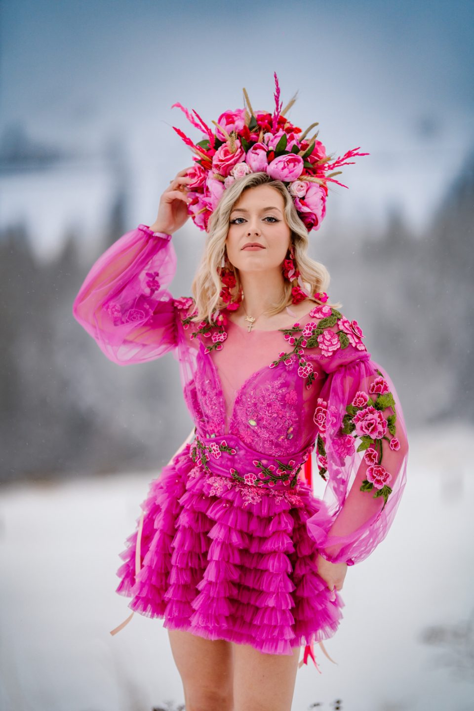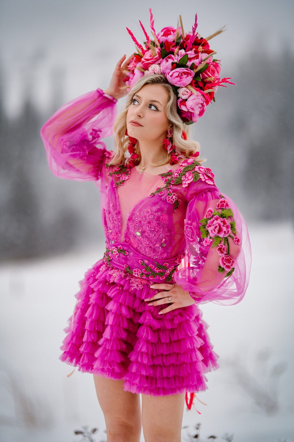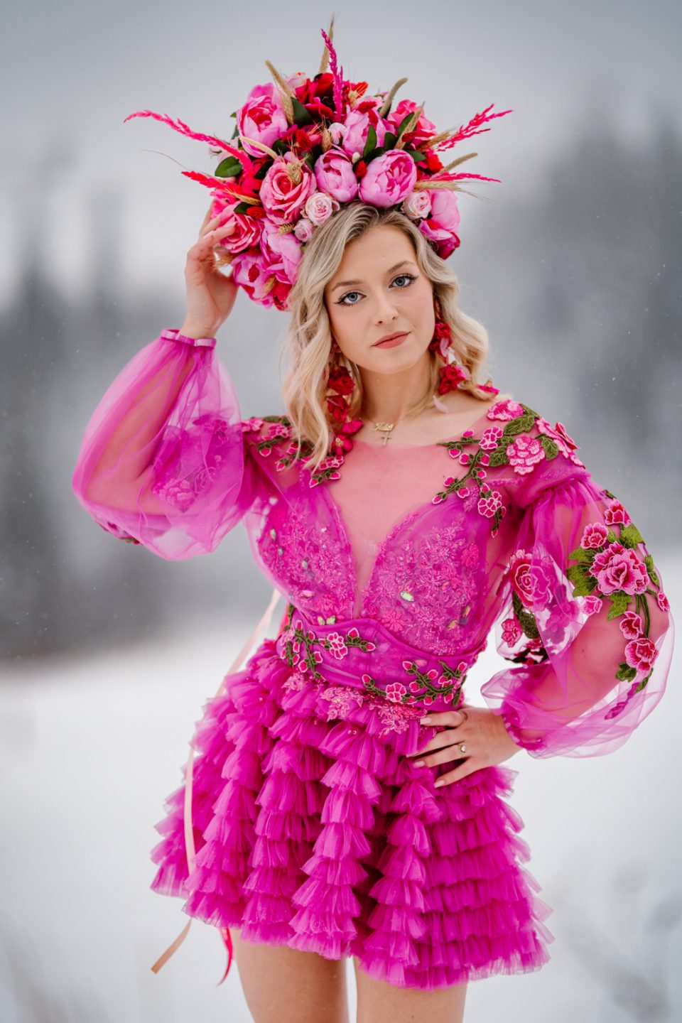Na głowie – korona z kwiatów dostępna w zakładce Korony i wianki, która dopełnia look jak z baśni.