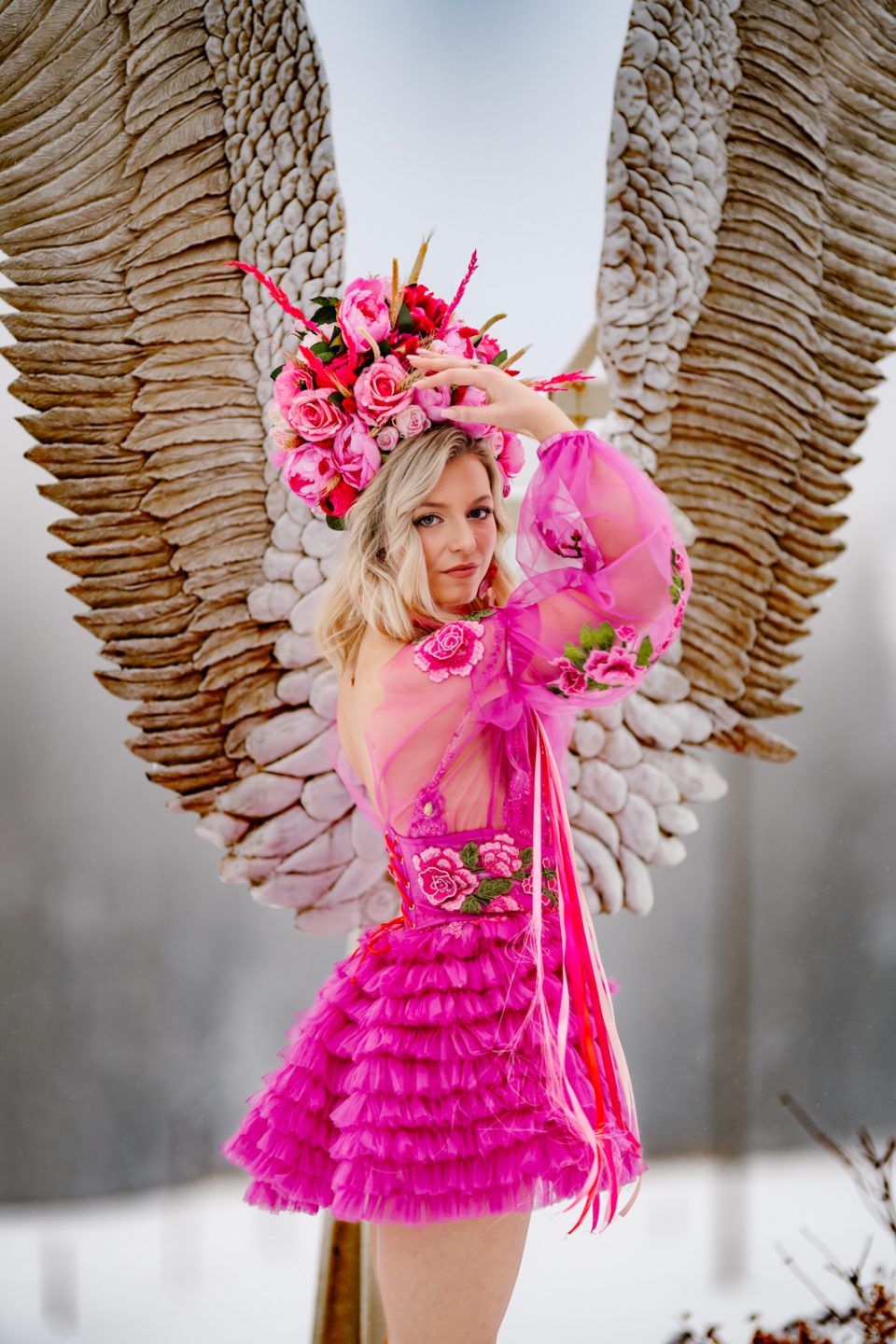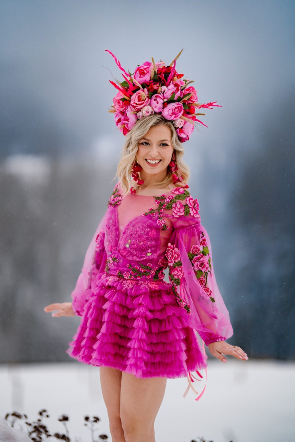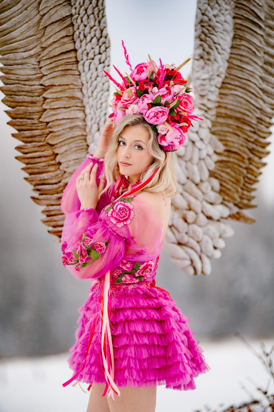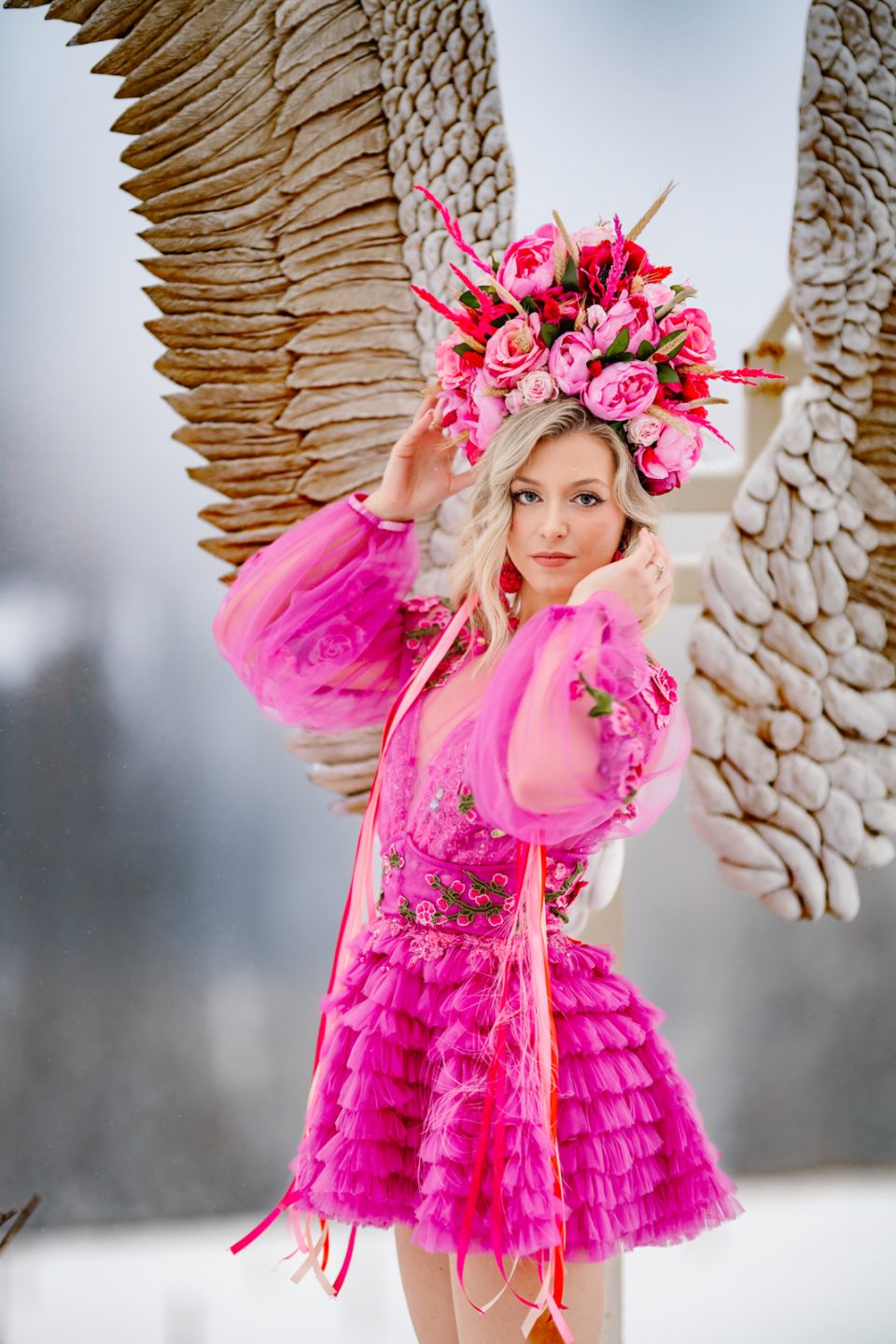 Na głowie – korona z kwiatów dostępna w zakładce Korony i wianki, która dopełnia look jak z baśni.