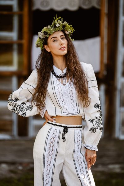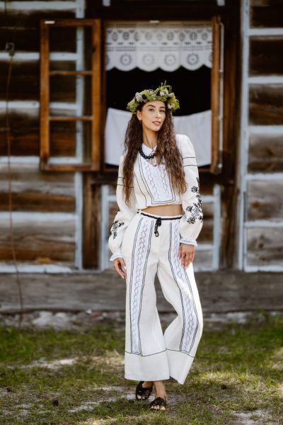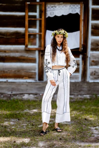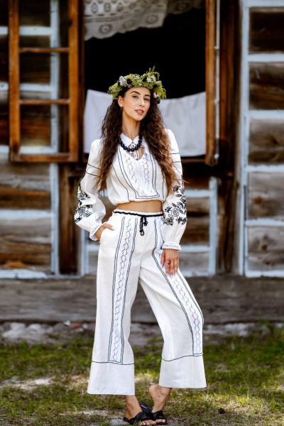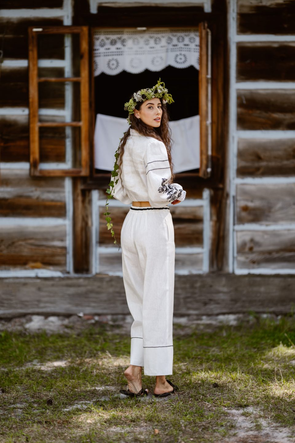 Bluza z ściągaczem na brzuchu jest lekka, a jednocześnie wyrazista. Jej długie rękawy zdobi subtelny haft łańcuszkowy inspirowany wzorami wilanowskimi, a aplikacja na przodzie, wykonana na drutach, wprowadza do stylizacji nutę rękodzielniczego ciepła. Wiązanie przy szyi na lniany sznureczek sprawia, że całość nabiera kobiecej miękkości i naturalnego wdzięku.