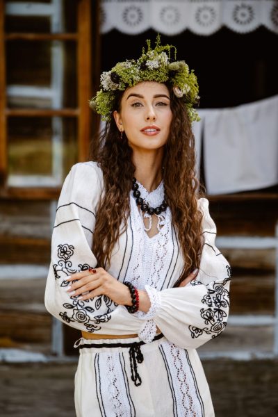 Dopełnieniem zestawu jest biżuteria z prawdziwego bursztynu – korale, bransoleta, pierścionek i kolczyki. Ich głęboka, złocista barwa rozświetla śmietankową tkaninę i staje się symbolem siły zaklętej w naturze.