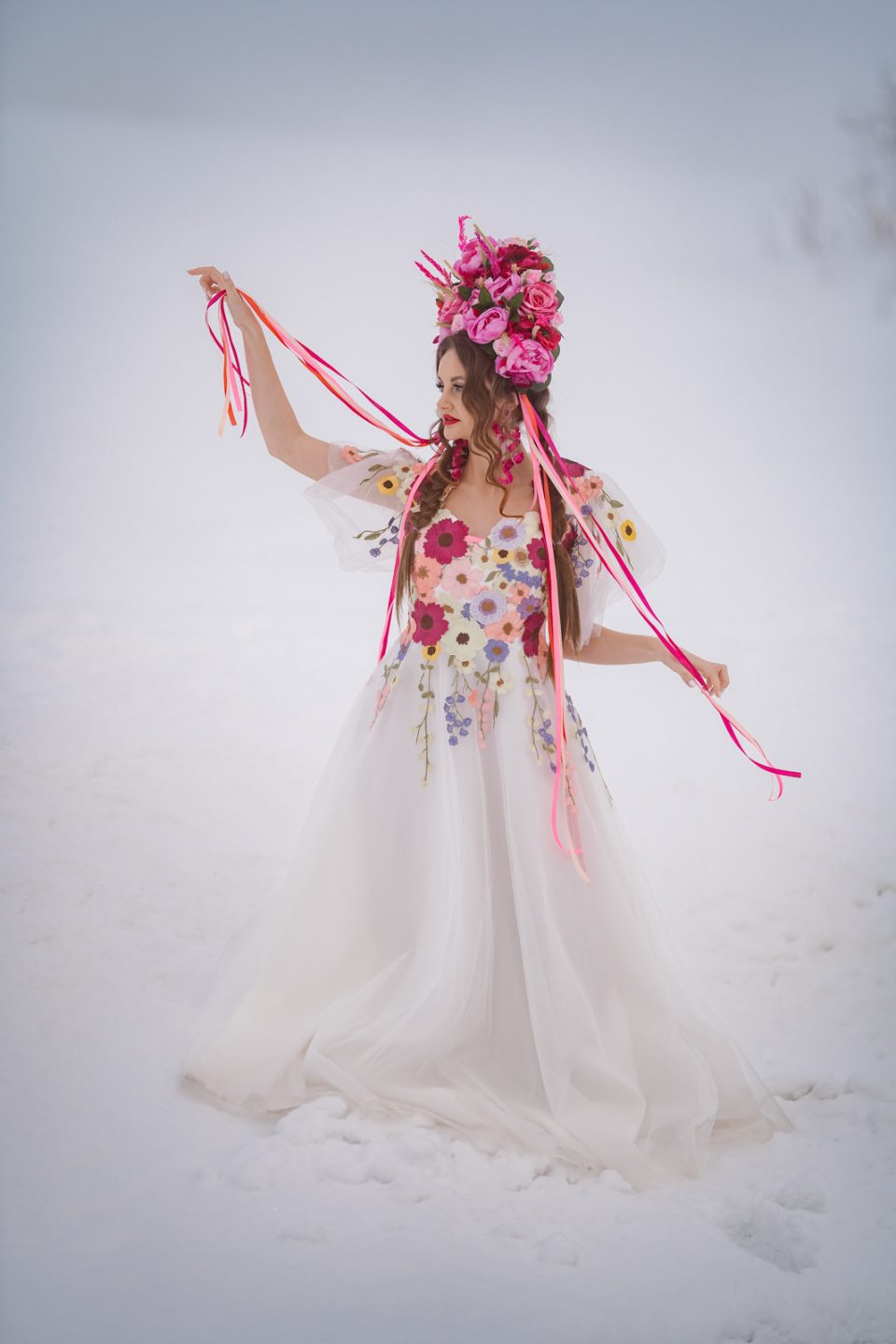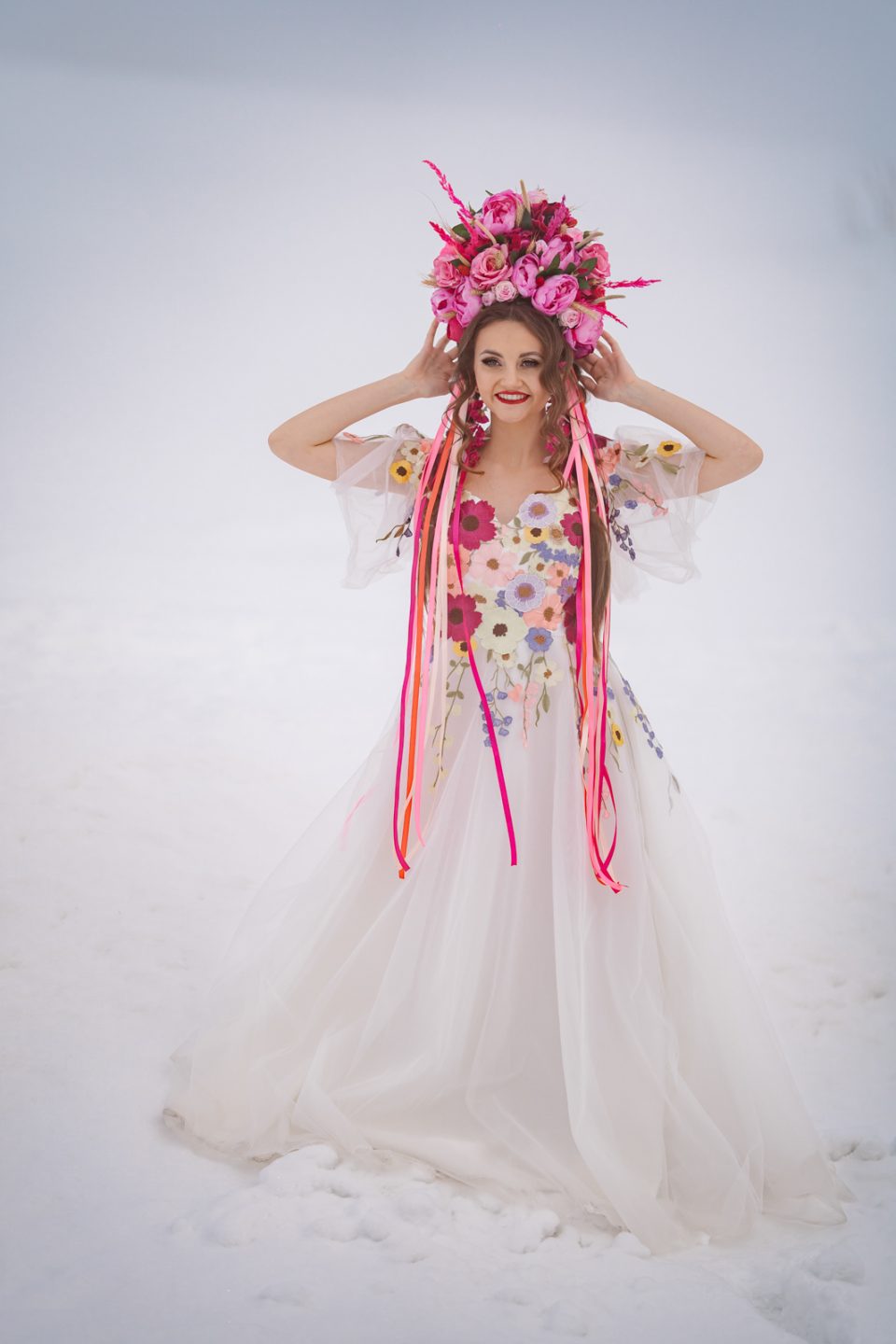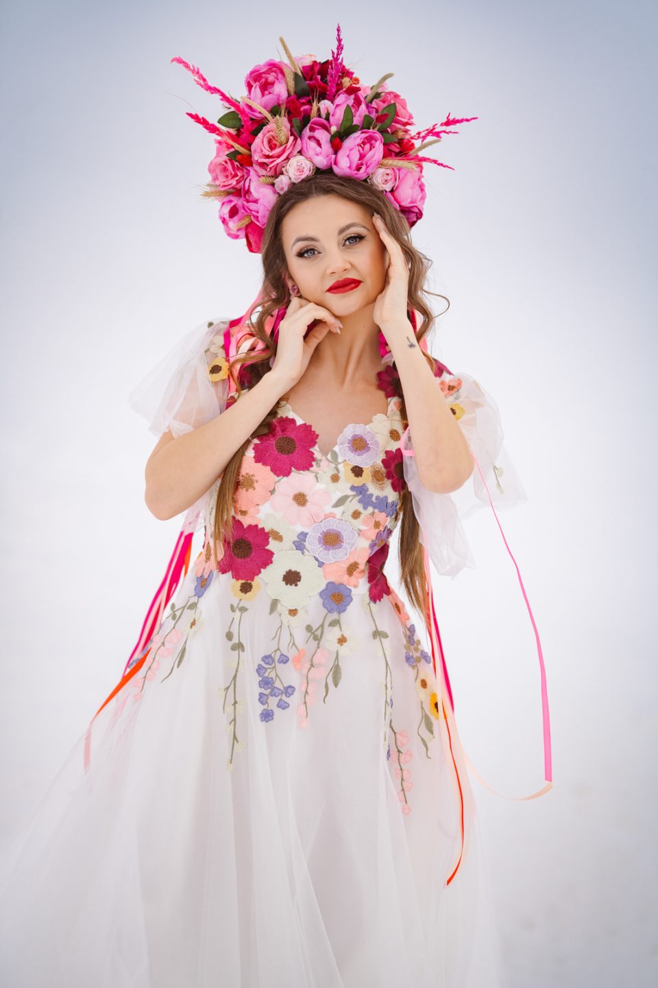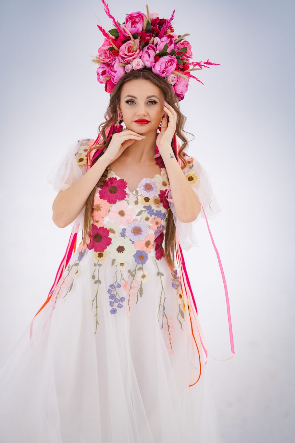 Gorset w kształcie serca, wiązany z tyłu, zapewnia idealne dopasowanie do sylwetki, eksponując talię i dodając lekkości całej kreacji. Ręcznie haftowane, kolorowe kwiaty zdobią zarówno przód, jak i tył sukni, tworząc efektowny, kwiatowy wzór, który przyciąga wzrok i dodaje sukni niepowtarzalnego charakteru.
