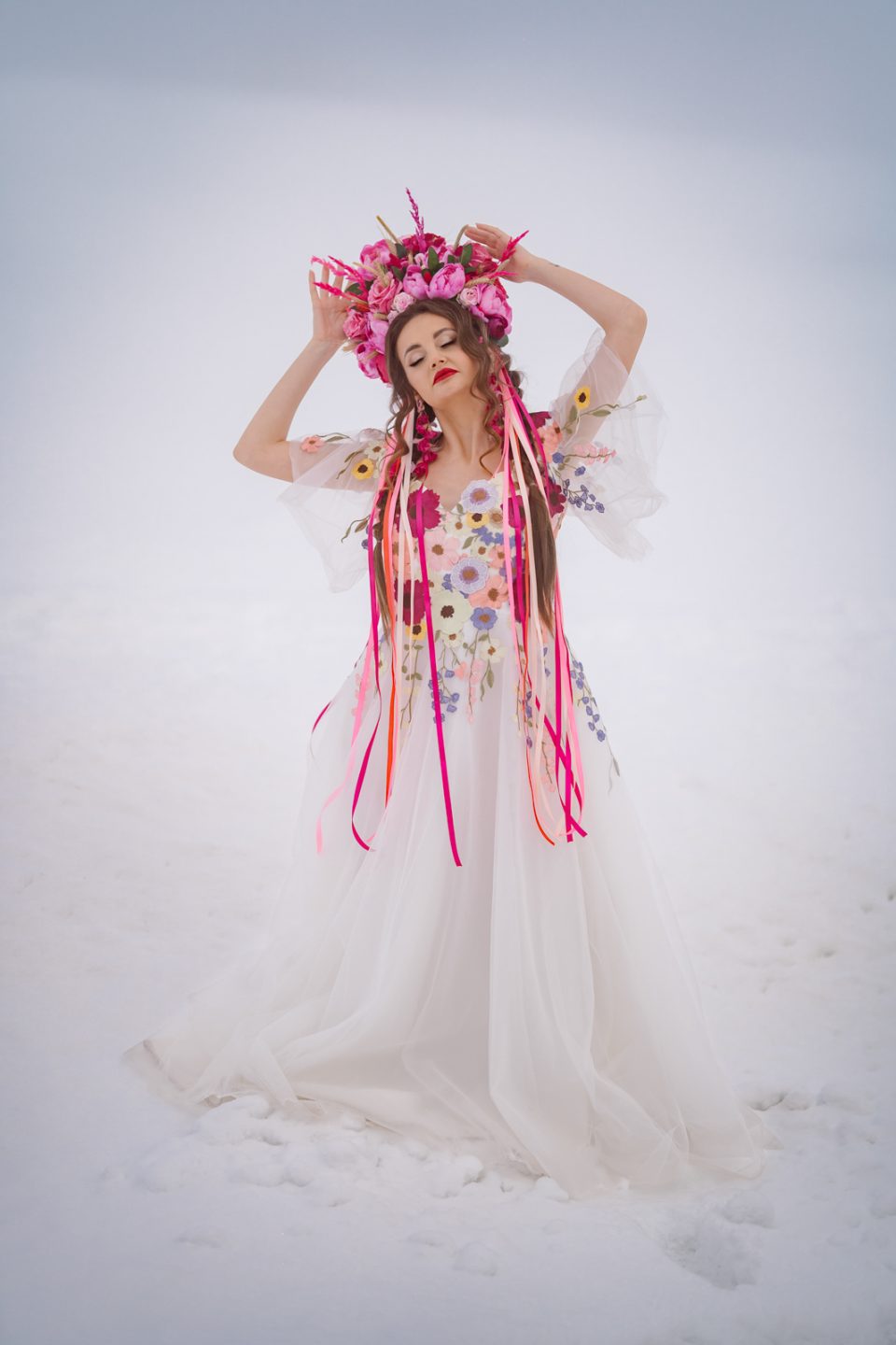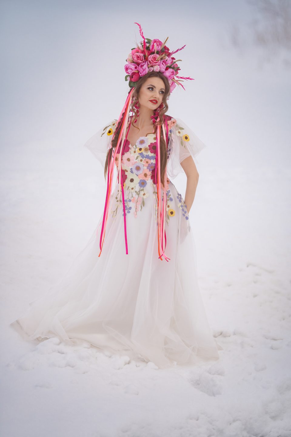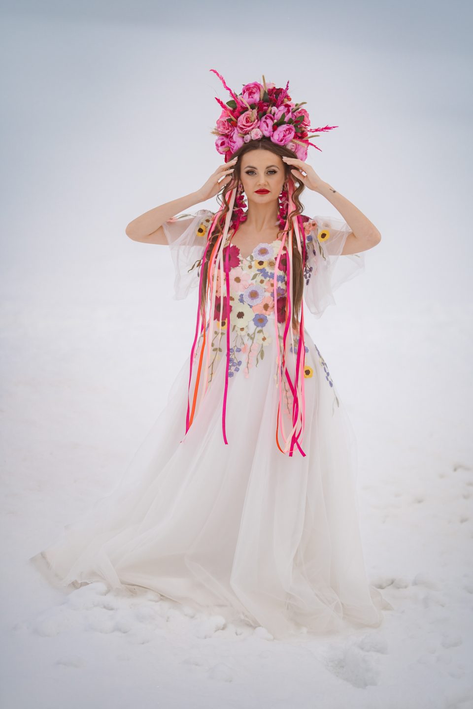 Gorset w kształcie serca, wiązany z tyłu, zapewnia idealne dopasowanie do sylwetki, eksponując talię i dodając lekkości całej kreacji. Ręcznie haftowane, kolorowe kwiaty zdobią zarówno przód, jak i tył sukni, tworząc efektowny, kwiatowy wzór, który przyciąga wzrok i dodaje sukni niepowtarzalnego charakteru.
