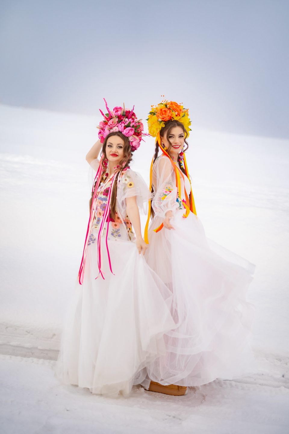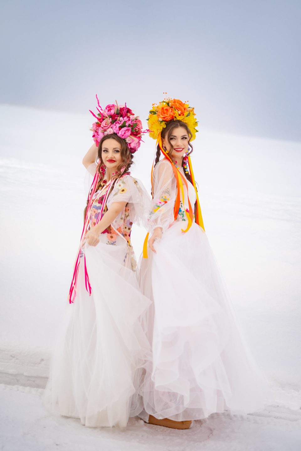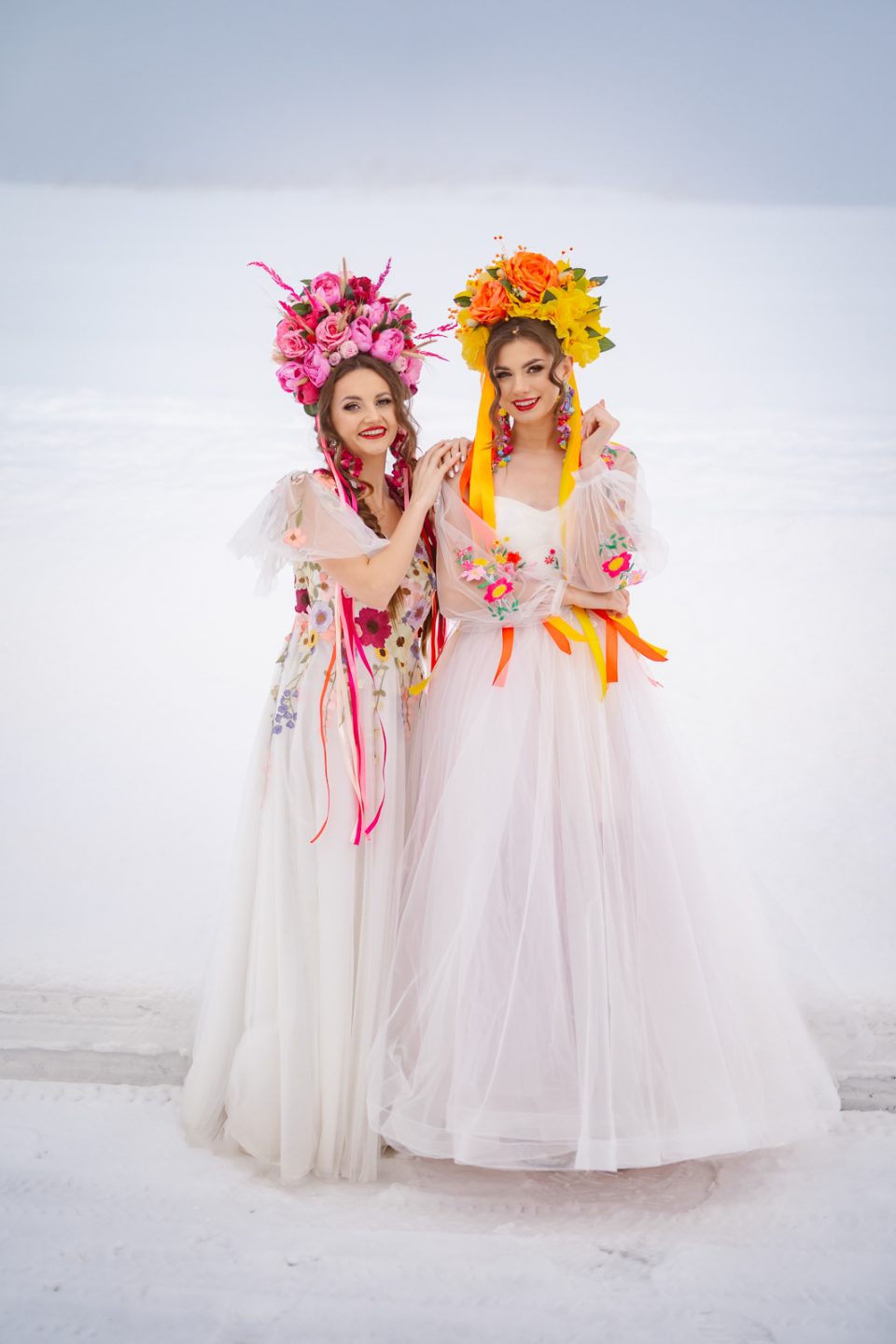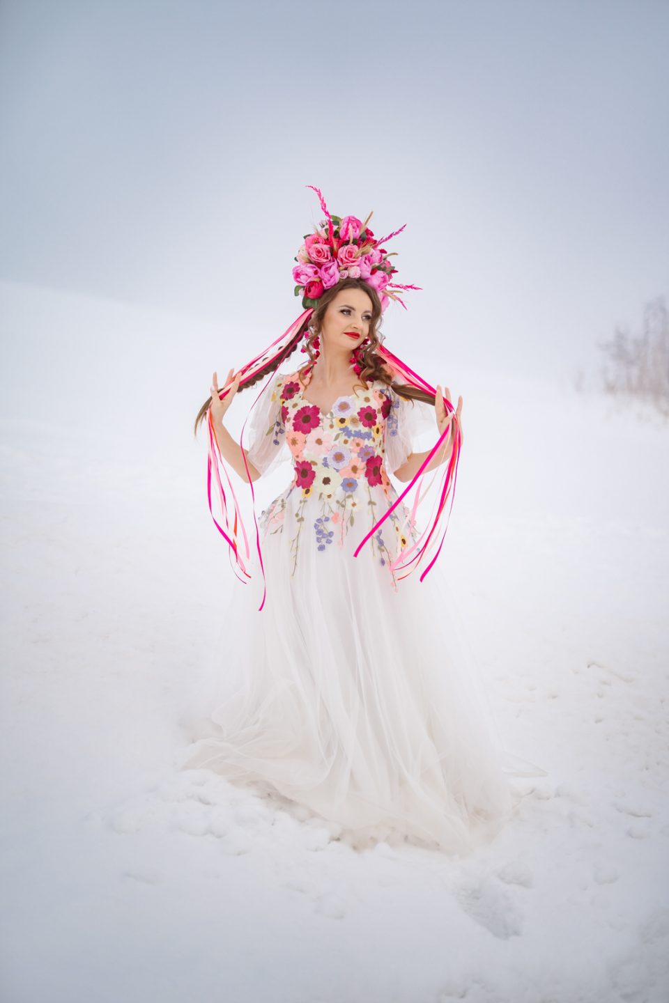 Gorset w kształcie serca, wiązany z tyłu, zapewnia idealne dopasowanie do sylwetki, eksponując talię i dodając lekkości całej kreacji. Ręcznie haftowane, kolorowe kwiaty zdobią zarówno przód, jak i tył sukni, tworząc efektowny, kwiatowy wzór, który przyciąga wzrok i dodaje sukni niepowtarzalnego charakteru.