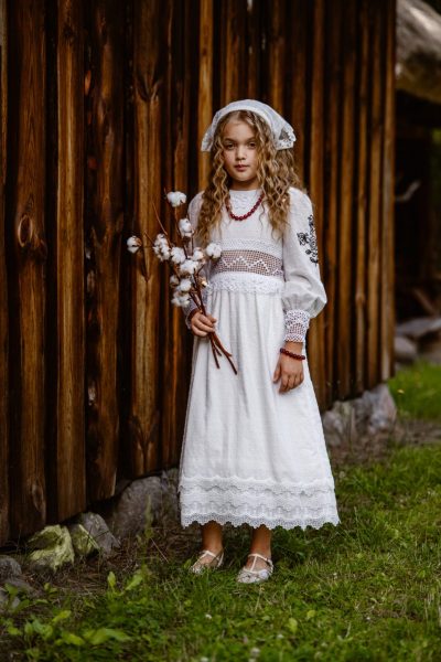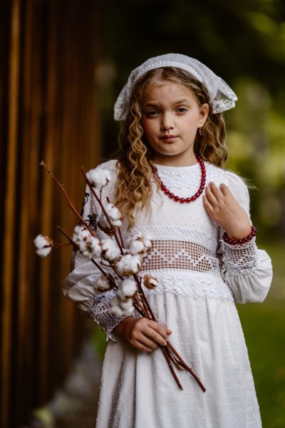 W sercu Mazowsza, gdzie śpiew ptaków splata się z legendami o dawnych królewnach, powstała Helena – sukienka dziewczęca, która jak opowieść o dzieciństwie przepełniona jest lekkością i czarem. Jej śmietankowa bawełna otula delikatnie, a długie rękawy zakończone misternym szydełkowym wzorem przywołują wspomnienie babcinych dłoni tworzących cuda z nici. Na ramieniu rozkwita czarny haft inspirowany wilanowskimi ornamentami – jak pieczęć tradycji, która od wieków zachwycała królów i damy dworu. Kołnierzyk i pokaźny gorsecik pod bluzką, także wyszywane ręcznie na szydełku, dodają jej wdzięku niczym koronka wpleciona w bajkę. Dół sukienki to rozkloszowana spódnica, zakończona subtelną koronką bawełnianą – lekka, dziewczęca, jak taniec na mazowieckiej łące. Helena to sukienka z duszą – codzienna, a jednak odświętna, zawsze niosąca w sobie serce Polski.