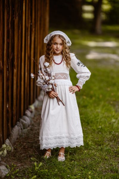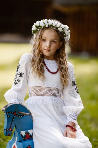 Sukienka „Helena” to wyjątkowy projekt dla dziewczynki na co dzień – lekka, dziewczęca, a jednocześnie nawiązująca do bogatej tradycji rękodzieła Mazowsza. Śmietankowa bawełna, połączona z ręcznym szydełkiem i czarnym haftem inspirowanym motywami wilanowskimi, tworzy subtelną całość, w której tradycja przenika się z nowoczesnym krojem. Sukienka idealna na rodzinne spotkania, spacery czy wyjątkowe chwile dzieciństwa, w pełni oddaje ducha kolekcji.